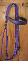 Matt Purple Biothane with Stainless Steel fittings. Can be used as a simple bridle without a noseband with a bit attached to the end buckles or can be used with a Hackamore Noseband, where the nose band is buckled to the hackamore pieces,